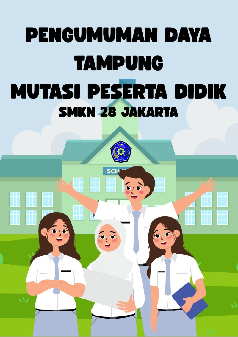 Dengan hormat, kami sampaikan bahwa dalam rangka memberikan kesempatan layanan pendidikan yang merata dan berkeadilan, SMKN 28 Jakarta membuka penerimaan mutasi peserta didik untuk jenjang kelas X dan XI pada semester genap tahun pelajaran 2025/2026. Mutasi ini diperuntukkan bagi peserta didik dari sekolah lain dengan kompetensi yang sama ingin melanjutkan pendidikan di SMKN 28 Jakarta, dengan tetap memperhatikan ketentuan yang berlaku.